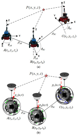 Omnidirectional visual localization between poses A and B. (a) Robot reference system; (b) camera reference system. Projections and are indicated.