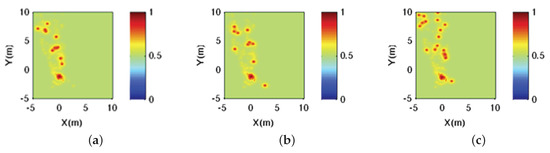 Evolution of the sensor data information distribution along poses, expressed in terms of the probability of existence, for example in Figure 6. (a): pose A; (b) pose B; (c) pose C.