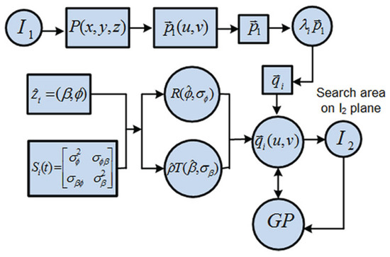 In this sense, Figure 5 breaks down the complete procedure for this advanced matching, which finally returns a reduced search area where candidate matching points are expected, rather than a global search over the entire image. The construction of this new search area comes from the reformulation of the epipolar constraint, which now transforms into an elliptical surface due to the effects of the omnidirectional adoption and to the drifts induced by . The final stage includes a visual descriptor comparison, and being the visual descriptors of two candidate matching points in the first and second image, respectively. In the end, a Mahalanobis metric [53], (), is evaluated over them, so as to get an acceptable visual distance in order to assume two feature points as a valid pair of matching points: