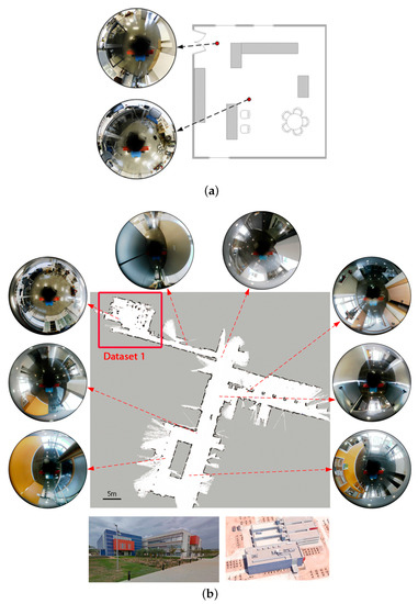 Main details for the large scenario where the two sub-datasets were acquired. (a) Layout for Dataset 1; (b) layout for Dataset 2.