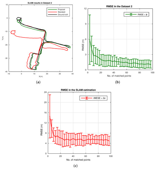 In this subsection, a number of tests is performed to evaluate the overall omnidirectional SLAM system, with the robust localization embedded. Notice that the redesign of the observation model, , in Equation (15), now implements the proposed robust localization. In this sense, Figure 14 shows real data results for such omnidirectional SLAM approach, using Dataset 2. In particular, Figure 14a confirms the suitability of the approach to produce a reliable estimation under a real application operation. Moreover, it is demonstrated to outperform the accuracy of a general SLAM approach, with standard localization, as presented in previous works [33]. This confirms the robustness of the estimation, which remains stable, whereas the estimation of the standard model tends to diverge in the presence of subtle error drifts on the localization. In addition to this, Figure 14b presents the average RMS results for the computed error, when the number of matchings is modified. Likewise, Figure 14c presents the same results for the standard localization. Again, these results confirm that a tradeoff setup with a low number of matching points still produces a well-balanced and feasible estimation.