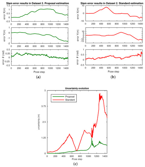 Next, Figure 15 presents more real data results regarding the error-time implications, which refer to the experiment shown in Figure 14. Figure 15a,b shows the behavior of the error on the estimated pose with the time step. In particular, Figure 15a expresses the evolution on the error for each coordinate in the omnidirectional SLAM approach, with the robust localization proposal embedded. Likewise, Figure 15b presents the error for the standard SLAM system, with the standard localization technique. It may be observed that the presented proposal outperforms the standard one.