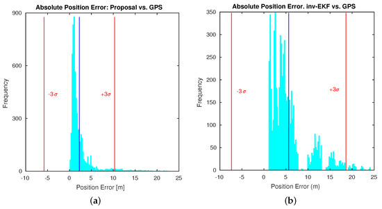 Histograms for the absolute position error (m) in Dataset 3: (a) proposed approach with alignment optimization; (b) inverse EKF approach with alignment optimization; (c) proposed approach without alignment optimization; (d) inverse EKF approach without alignment optimization.