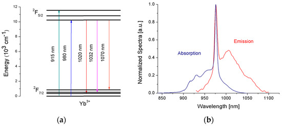 Among the different RE ions, Ytterbium is one of the most commonly used for the fabrication of phosphate fiber lasers. The electronic transition 2F5/2 → 2F7/2 (see Figure 1) can generate laser emission over a band of wavelengths ranging from ~970 to ~1200 nm, thus allowing a wide tuning ability of the output beam in the 1 µm window and short pulse amplification (down to fs regime) [22].