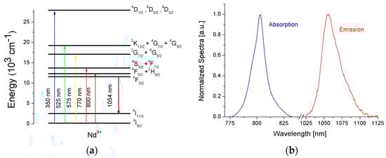 (a) Typical energy level diagram of Nd3+ ions in phosphate glasses; (b) Typical absorption and emission spectra of Nd3+ ions in phosphate glasses (adapted from [27]).