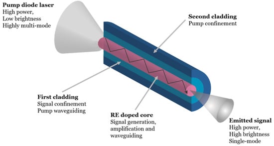 Nowadays, high power fiber lasers and amplifiers are typically implemented using RE-doped double-cladding (DC) optical fibers, a concept which was introduced in 1988 by Snitzer et al. [36] and has allowed in last decades a significant enhancement in scaling fiber lasers to higher power levels. DC fibers consist in a RE-doped core surrounded by a much larger inner cladding, itself surrounded by an outer cladding (see Figure 4). The pump light is launched and confined into the inner cladding and spatially overlaps the core. The pump power is then absorbed over the entire length of the fiber through multiple interaction with the core, thus exploiting the fiber geometry. The benefit of this design resides in the possibility to use multi-mode high power laser diodes with relatively poor beam quality and to obtain a single-mode fiber radiation with outstanding beam quality.