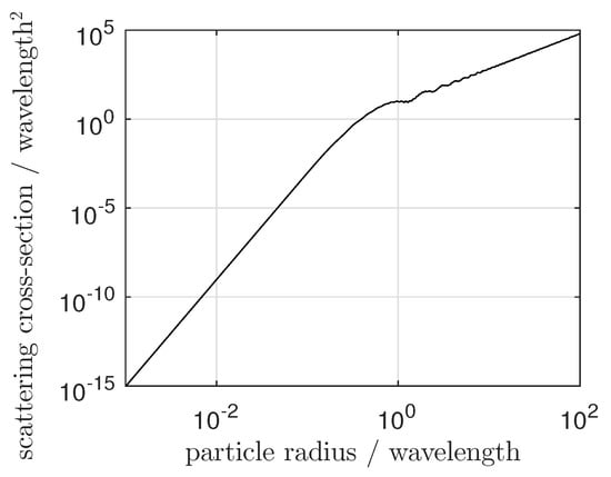 Calculated scattering cross-section over the particle radius normalized by the wavelength for a spherical particle made of diethylhexyl sebacate (DEHS) with a refractive index of 1.45 at 650 nm.