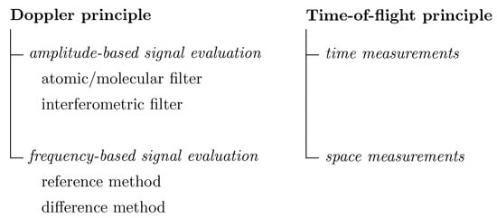 The velocity measurement approaches differ in the type of evaluation of the detected scattered light. One approach is to make use of the optical Doppler effect and to evaluate the momentum of the scattered light photons. Note that the photon momentum is Planck’s constant divided by the wavelength, so that the photon momentum also represents the wavelength property or the energy of a photon. The second approach follows from the kinematic definition of the velocity and the evaluation of the position property of the scattered light photons. Hence, the developed measurement principles can be categorized into two groups [28]: