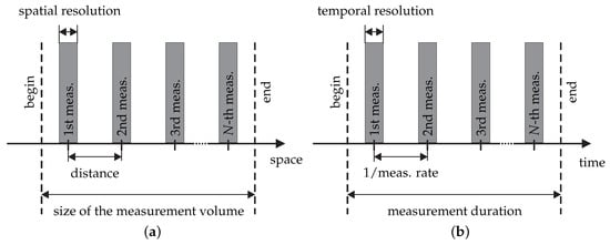 The term measurement rate requires temporally-equidistant measurements. Otherwise, a mean measurement rate can be specified. The introduced terms are explained in Figure 5b. Note that the temporal resolution does not necessarily equal (or is smaller than) the reciprocal value of the measurement rate. Both quantities are independent. - Each velocity value over space and time can finally be characterized with a measurement uncertainty by applying the international guide to the expression of uncertainty in measurements (GUM) [38,39]. According to the GUM, the measurement uncertainty is a parameter, associated with the result of a measurement, that characterizes the dispersion of the values that could reasonably be attributed to the measurand.