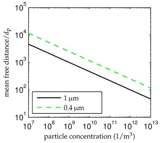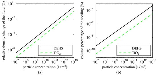 An example is given in Figure 6a, where the change of the mean air density (at room temperature) is shown as a function of the seeding particle concentration considering for DEHS and TiO (cf. Table 1) as the seeding material, respectively. Even at particle concentrations of 1013/m3, which are hardly achievable [138,139], the density change is below 1%. Since the particle concentration is typically several orders of magnitude lower, the influence of the seeding on the air flow density is usually negligibly small. The change in viscosity and the general change of the flow due to the presence of two phases is not known here. However, the low volume percentage of the seeding leads to the assumption that it is negligible as well. The volume percentage is shown in Figure 6b over the particle concentration. It is always below 0.001%. As a result, the retroaction of the seeding is usually negligible compared with other error sources.
