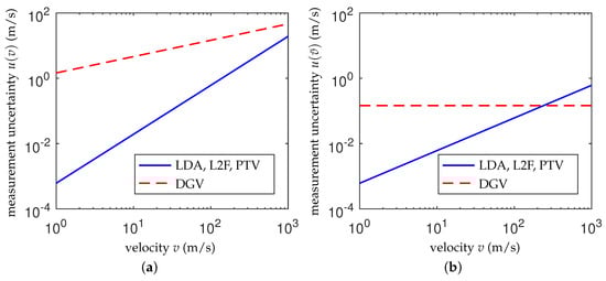 Note that each effect (discussed here, as well as others) propagates to a measurement uncertainty of the flow velocity. The computation of the uncertainty propagation and the combination of all uncertainty contributions is possible by means of analytic propagation calculations or Monte Carlo simulations, which is described in the international guide to the expression of uncertainty in measurements (GUM) [38,39]. For uncorrelated uncertainty contributions, the combined measurement uncertainty is the square root of the sum of all squared uncertainty contributions. As a result, the largest uncertainty contribution dominates and thus limits the total measurement uncertainty. However, the aim of the section is not to derive a complete measurement uncertainty budget, but to review fundamental measurement limits, which always occur in the measurement uncertainty analysis of flow velocimetry techniques based on Mie scattering.