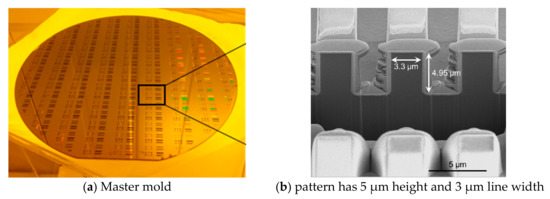 To increase the durability of the mold during repeated ultraviolet nanoimprint lithography (UV-NIL) processes and to separate the cliché smoothly, a surface treatment process to lower the surface energy was conducted. The coating process consisted of forming a self-assembled monolayer (SAM) on the surface of the master mold and reducing the surface temperature. The material used for this process was octadecyltrichlorosilane (OTS). The OTS coating process was carried out by vapor deposition in which the wafer was placed in a beaker, and OTS solution was vaporized using a hot plate kept at a temperature of 120 °C for one hour [20]. The entire process was carried out in an N2 atmosphere and the vaporized OTS was deposited on the master mold patterns.
