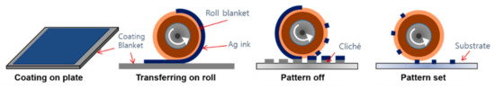 The process of reverse offset printing used in this experiment is schematically explained in Figure 3. First, Ag nanoparticles containing ink are spin-coated on a substrate called the coating blanket. Then, the ink is transferred from the coating blanket to the roll blanket wrapped on a cylinder. Next, the roll blanket moves over the cliché with adequate pressure for patterning. Since the cliché has higher adhesion than the roll blanket, the Ag ink in the non-printed area is taken away from the roll blanket. Finally, the remaining Ag ink on the roll blanket is transferred to the final substrate by rolling and pressing, and the process is finished after drying the printed pattern in hot air. In reverse offset printing, the printing quality is determined by the adhesion and cohesion of the ink. At the off step by the cliché, the ink cohesion must be overcome by the adhesion to the blanket to have the ink cut at the edges of the patterns of the cliché [24,25]. The equipment used in this study is shown in Figure 4. The ink used in this experiment was ANP Ag ink which has 25 wt % of Ag particles, a viscosity of 1.5 cps, and a surface tension of 24.3 mN/m before spin-coating. In order for the cliché to detach the ink, the adhesive force between the cliché and the ink must be greater than the cohesion force of the ink. Cohesion is a physical property of a substance caused by the intermolecular attraction and it is one of the factors responsible for viscosity. Therefore, rheological properties, like viscosity of the ink, also have a large influence on the transfer. However, in this study, the solvent was evaporated because the ink was spin-coated at the first step, and the viscosity of the pattern off step is thereby significantly different from the original viscosity of the ink. To reduce this complexity, the type of ink was fixed and the printing experiments were carried out.