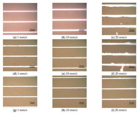 Results for printed pattern with 2-μm line width in reverse offset printing: (a) 1 mm/s, (b) 10 mm/s, and (c) 20 mm/s printing speed using PUA1 (surface energy: 21.5 mN/m); (d) 1 mm/s, (e) 10 mm/s, and (f) 20 mm/s printing speed using PUA4 (surface energy: 30.5 mN/m); and (g) 1 mm/s, (h) 10 mm/s, and (i) 20 mm/s printing speed using PUA5 (surface energy: 79.1 mN/m).