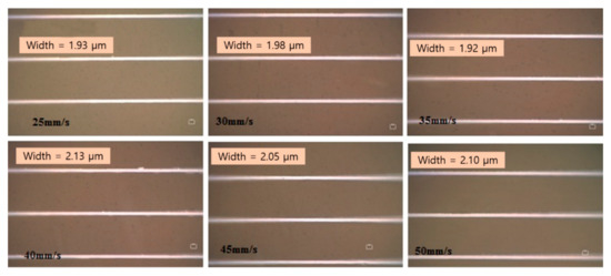Results for the printed pattern with a 2-μm line width in reverse offset printing using PUA5 resin as the cliché material with the highest surface energy (79.1 mN/m) at printing speeds ranging from 25 mm/s to 50 mm/s.