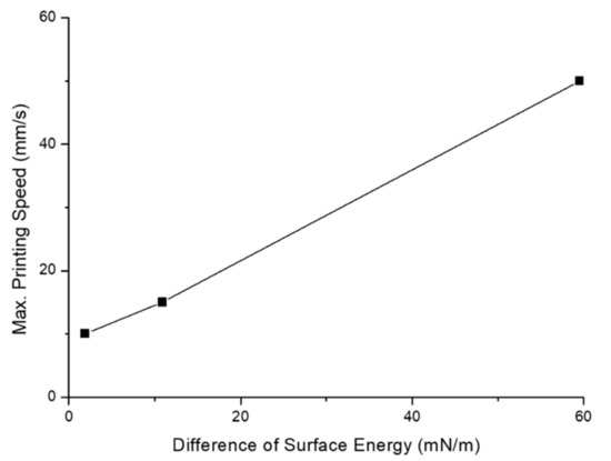 Figure 5 shows the printing patterns obtained at various off speeds for each resin. Referring to the process conditions when using glass- or Si-patterned clichés, the range of the normal printing speed to achieve fine patterns was set from 1 mm/s to 5 mm/s. At 1 mm/s, where the off-speed was slow, there was no significant change in the printing quality, irrespective of the resin used. However, as the off-speed increased to 10 mm/s and 20 mm/s, it was confirmed that a high printing quality could be obtained only when the resin with the highest surface energy was used as the cliché material. When the resin with a surface energy not significantly different from that of the blanket was used as the cliché material, the pattern off process was not effectively performed when the speed was increased. However, when PUA5 with a surface energy of 79.1 mN/m was used, which was considerably different from the surface energy of the blanket, the off process was effective at a high printing speed. Therefore, a high difference in the surface energies of the resin and blanket can enhance the printing speed. Figure 6 shows the results at a printing speed of 50 mm/s using the cliché with high surface energy. Although the speed is nearly 10 times faster than the conventional printing speed, the print quality does not show any sign of deterioration. The relationship between the maximum allowable printing speed and the surface energy difference is expressed by the graph shown in Figure 7. The larger the difference in the surface energy of the blanket and flexible cliché, the larger is the maximum allowable printing speed.