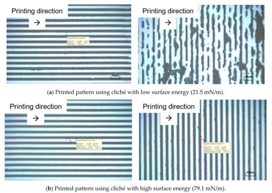 In addition, the printing quality varies depending on the angle between the movement direction of the roller and the pattern, which can also be explained by the relationship between the cohesion force and adhesion force of the ink and substrate. As shown in Figure 8a, if the direction of the roller is aligned with the direction of the pattern, the cliché detaches the ink easily because the amount of ink to be removed from the blanket at one time is relatively small. In addition, once separated ink has continuously encountered the pattern edge, detachment can occur easily, like crack propagation. However, if the direction of the roller is perpendicular to the direction of the pattern, it does not work well because a relatively large amount of ink should be detached from the blanket at one time. That is, in this case, the separation of the ink did not occur continuously, but the separation should be uniformly performed along a large width of the pattern edge. This angle dependency can be improved using a cliché having a high surface energy, as shown in Figure 8b. When a cliché with a surface energy of 79.1 mN/m was used, it was found that even if the direction of the pattern and the rolling were perpendicular to each other, the pattern detachment was efficiently performed and there was no problem in printing. Therefore, it can be concluded that it is effective to use a cliché having a high surface energy to form various patterns, such as the gate line of a TFT.