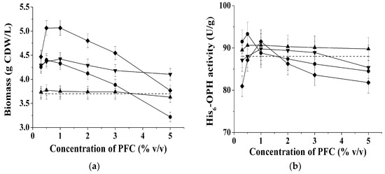 Analysis of the influence of these substances on the growth of E. coli SG13009[pREP4] cells that were transformed with pTES-His6-OPH plasmid and on the synthesis of the His6-OPH was performed via varying the initial concentrations of these PFCs in the initial culture medium in the range of 0.3%–5% (v/v) (Figure 1a,b, Table 2). Cultivating of the same cell strain under identical conditions, but in the absence of PFCs was used for control.