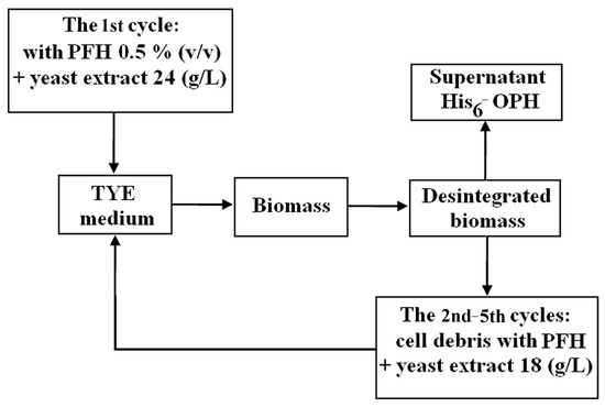 The culture medium thus obtained was used for the accumulation of the next batch cultivation of His6-OPH-containing cells (Figure 2 and Figure 3). This procedure was repeated five times. For control, the E. coli SG13009[pREP4] cells were cultivated in TYE culture medium, where 1/4 of the yeast extract was replaced with disintegrated biomass accumulated in the absence of PFH.