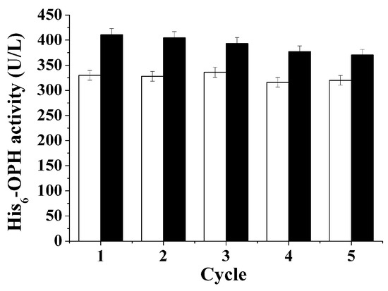 Accumulation of the total His6-OPH activity in the course of multiple batch re-use of PFH (white bars–control, black bars—cells cultivated in the medium containing 0.5% (v/v) of PFH).