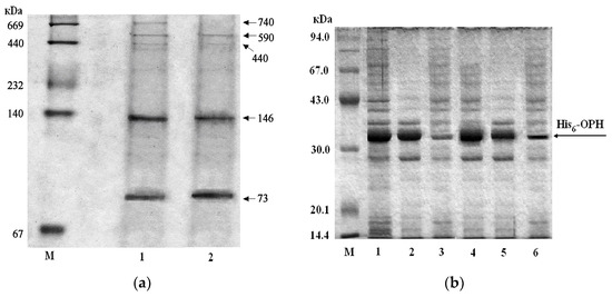 The electrophoregram conducted under non-denaturing (a) (1—without PFH addition, 2—with PFH addition) and denaturing (b) conditions (1–3 without PFH addition, 4–6 with PFH addition, the 1,4—total protein fractions; 2,5—insoluble protein fractions, 3,6—soluble fraction), reflecting the impact of the presence of PFH in the culture medium on the biosynthesis of OPH. M—markers of molecular weight.