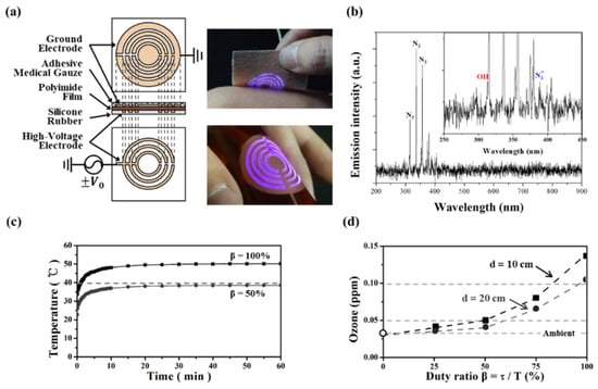 (a) Schematic illustration of the plasma pad and photographs of the thin-film plasma pad discharge; (b) Optical emission spectroscopy of plasma pad discharge; (c) Variation of temperature measured inside the pad attached to the skin with β = 100% and β = 50% during 1 h operation; (d) Ozone concentration according to the duty ratio at the distances of d = 10 cm and d = 20 cm over the plasma surface.