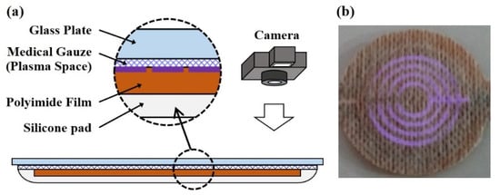 In this study, the use of medical gauze is a distinctive feature of the plasma pad. While the pad is attached to skin, plasma is generated in the gauze between the pad and the skin. The medical gauze plays the role of a spacer, securing a void space for the generation of plasma. Another advantage is that medical gauze can be used for various skin care purposes by applying medication as a gel or ointment, which will not prevent plasma ignition in the gauze. As shown in Figure 3, plasma generation between the pad and skin is visually verified by attaching the plasma pad to a glass plate rather than to human skin. Figure 3a shows the layers comprising the pad. Because the discharge is not visible when the pad is attached to skin, the pad is placed on the glass plate to visually verify the discharge underneath the glass plate. Figure 3b shows a photograph taken from over the glass plate. The photograph shows that the plasma was generated in the gauze space, even with the pad attached to the glass plate. The ring pattern of plasma reflects the pattern of the ground electrode placed on the polyimide film as shown in Figure 2a.