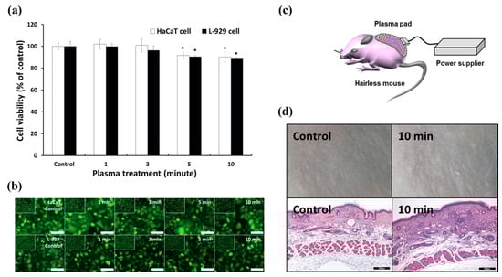 None of the plasma treatments triggered skin irritation at any site, nor did plasma treatment induce intracutaneous damage, as shown in Figure 4c. Additionally, no symptoms related to skin tissue toxicity or abnormal behaviors, such as convulsions or prostration, were observed, even after treatment for 10 min. The results demonstrate that treatment with a plasma pad is minimally toxic to skin cells, HaCaT and L-929 cells, and mouse skin, and the plasma pad is biocompatible for use in skin treatment.