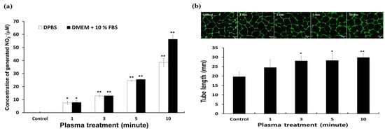 Plasma is known to catalyze and regulate biochemical activities and cellular responses such as proliferation, differentiation, and cell death or apoptosis [36]. The responses may be due to the ROS and RNS generated by non-thermal plasma [37]. Among the various reactive species, NO can modulate angiogenesis, resulting in the promotion of wound healing. Therefore, we analyzed exogenous generated from plasma by using Griess reagents. As shown in Figure 5a, plasma treatment significantly increased exogenous in both DPBS and cell culture media in a time-dependent manner, and the amount of generated reached a maximum 60 mM with 10 min of plasma treatment. This indirectly indicates that the NO generated from plasma plays a key role in vascularization and wound healing.