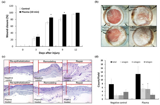 To confirm wound healing efficacy, recovery was evaluated by using the rate of skin re-epithelialization, remodeling, and repair in each slide sample after staining with H&E. The rate of wound repair in the plasma-treated group was 1.3-fold higher than that in the negative control group, calculated as 12.5% in negative controls and 16.7% in the plasma-treated group. This indicates that plasma treatment induced accelerated wound repair at Day 21 compared to the controls. Histological analysis also exhibited the same result as shown in Figure 6c. The histological images of skin treated with plasma showed re-epithelialization with thick epidermis and increased dermal fibroblasts, resulting in dense dermal fiber, remodeling with some skin adnexa including hair follicles and dense dermal fibroblast, and complete wound repair with skin adnexa and increased hair follicles. Hair follicles in anagen and catagen stages were significantly increased compared with the control group, as shown in Figure 6d. On the other hand, compared with the plasma-treated group, the negative control group showed re-epithelialization of thin epidermis, skin remodeling with fewer dermal fibroblasts, less deposition of collagen, and wound repair with fewer total hair follicles and increased telogen-stage follicles.