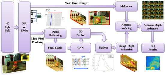 Light field imaging, as a relatively new technique, can record both the angular and spatial information of the scene in a single exposure [5]. It can either be recorded by a camera arrays or by a main lens combining with a micro lens arrays in front of the sensor [6]. Currently, along with the development of the manufacturing technology, consumer cameras that acquire light fields are starting to be commercially available in the market, such as Light [7] and Lytro [8]. The description of the light field was originally represented by a plenoptic function with five dimensions, and was reduced to four dimensions by Levoy and Hanrahan [9], who introduced two-plane parametrization to parametric the light field. Many advanced processing techniques was developed based on four-dimensional (4D) light field representation, such as post-digital refocusing, view point changing, aperture changing, and extending the depth of field at large aperture [10]. For 3D vision, light field imaging contains rich disparity and defocus information that can be used to evaluate the depth of the scene much more accurately than conventional stereo vision [10,11,12,13]. In light field imaging, depth estimation methods may generally be divided into two categories, including depth from stereo and depth from defocus. When comparing with stereo vision, the light field has unique ability to expand of the disparity space to a continuous space [11]. Hence, digital refocusing algorithm can be implemented and defocus response becomes additional cue to estimate the depth of the scene. For defocus cues, it avoids the occlusion problem [14] and matching ambiguity problems [15]. Traditionally, the defocus cue has been achieved through using multiple image exposures [16], which is however too slow to be used in recognition. Fortunately, the light field inherent refocusing ability can obtain a series of images that focus on different depth with highly parallel computation. This makes the fast estimation of the depth from defocus possible. Several research has also been conducted to combine both the disparity and defocus response so that the accuracy of the estimation can be further improved [17,18].