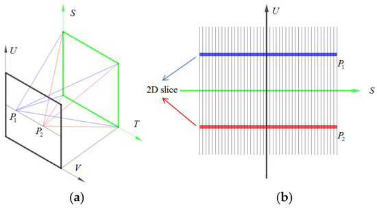 Digital refocusing is essentially a process of refocusing the scene at different depth based on the light field via pure digital computation. As shown in Figure 3a,b, the ray passes through UV plane to focus on the green ST plane. The distance between the two parallel planes is the focal length f and focal point o is on the ST plane. The irradiance of point o is obtained by integrating the entire UV plane as given by Equation (1) [6]: