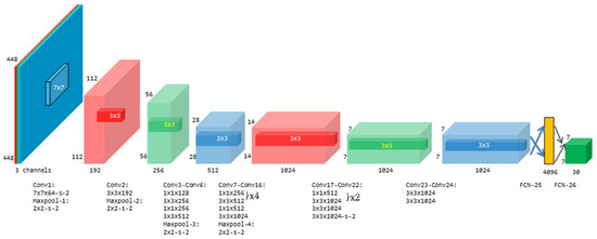 Secondly, each grid containing the center of the detected object is used as initial condition to predict the bounding box for the corresponding object. Each bounding box contains five parameters, including x, y, w, h, and corresponding confidence. (x, y) are the shift of the center of bounding box from the corresponding grid, and the (w, h) are the dimension of the bounding box. The confidence means the possibility that there is a detected object and how precisely the box is located. Thirdly, the object contained in each box also needs to be classified by the confidence of every class Pr(Classi|Object). Hence, in the currently study, the CNN contains 26 layers, including 24 convolutional layers and two fully connected layers, as shown in Figure 4. The convolutional layers are made of two different kernels including 3 × 3 and 1 × 1 kernels. Besides, two boxes with different initial values are used to get a more precise box for complex scenario. The first FCN is a 4096 vector and the output is 7 × 7 × 30. Here 7 × 7 are the number of the grids. 30 corresponds to 20 classes and 10 parameters for the two boxes. The CNN is trained in two steps. In the first step, the first 20 convolutional layers, the average pooling layer and the fully connected layer are pre-trained by Image-Net 1000-class datasets [22] to get a robust and general feature extractor. In the second step, the final two layers are deleted and other four convolutional layers and two fully connected layers are trained together with pre-trained 20 convolutional layers by using the PASCAL [23]. More details of the CNN can be referred to [19].