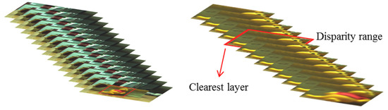 The depths of the detected objects are then estimated by the defocus response of the focal stacks at the bounding box. As shown in Figure 5, the bounding boxes are used to sub-sample the series of the focal stacks that were generated by digital refocusing, as presented in Section 2.2. Then, the sub-sampled regions are analyzed by defocus to find the clearest layer. For defocus analyzing, the gradient stacks can be computed via convolution. Different convolution kernels would result in different defocus response. It is stated in previous work [19] that the sum modified Laplacian (SML) operator has better performance than traditional operators, such as Sobel, Laplacian. This paper modifies the SML and present the sum squared modified Laplacian (SSML) operator to get sharper response at the focused layer, given by Equation (7):