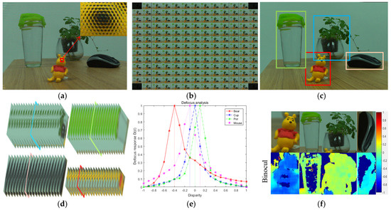 Application of the proposed method in real scene. (a) Light field data collected by Lytro Illum. (b) The decoded light field data. (c) Identified objects on all-in-focus image. (d) Focal stacks of object regions. (e) Depth estimation by defocus response. (f) Depth estimation per pixel by multi-baseline stereo matching.