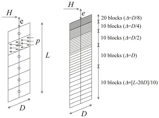- 10 blocks with a thickness ∆ = (L − 20D)/10, starting from a depth of 20D up to the pile base depth.