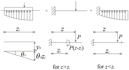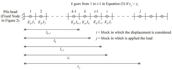 In Equation (3), zi and zj represent the distance between the fixed node in Figure 2 and the point along the beam in which the displacement is considered and the distance between the same fixed node and the point where the load is applied, respectively. On the other hand, lk, represents the distance between the fixed node and the lower part of block k, and EpIk is the flexural rigidity of block k (Figure 3).