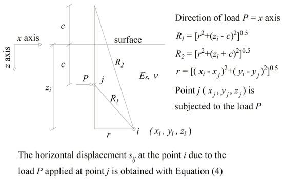 The “far-field” soil (soil at small strain level) is modeled as a multi-layered elastic half-space. BEM analysis requires an appropriate elementary singular solution to be integrated on the surface of the problem domain. In the case of piles subjected to horizontal loading, the elastic Mindlin [] solution is generally used. This solution, which evaluates the pile-soil interactions, is valid and rigorous only in the case of a homogeneous elastic half-space, however it can still be considered valid in the case of a multi-layered elastic half-space as reported by Poulos and Davis []. The horizontal displacement sij at a point i belonging to the half space by a horizontal load Pj applied at point j can be expressed as in Equation (4) (Figure 4). Where the term bij represents the general expression for each “far-field soil” flexibility matrix coefficient.