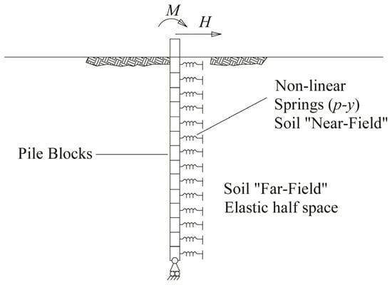 The “near-field” soil (soil subjected to high stress and strain variations) and its non-linear response is introduced by placing non-linear springs (zero-length elements) in series to each pile-half-space node (Figure 5), with a shape dependent on the soil type. In the present study, the “p-y” curves proposed in [,,] are used. The input data required for the soil are: the elastic modulus Emax at small strain levels (which can be estimated starting with the maximum shear modulus Gmax), the Poisson ratio, and the angle of internal friction (and the relative density DR) or the undrained shear resistance if the soil is cohesionless or cohesive, respectively.