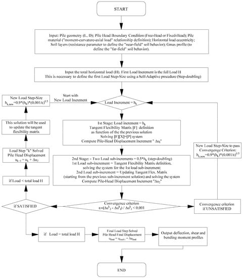 where p is the order of the method used (in the Euler method p = 1, in the Runge-Kutta method p = 4), and SF is a “safety factor” (taken as equal to 0.90) to guarantee the success in the next attempt. When this convergence criterion is passed, Equation (7) is used again to estimate the next step-size. The procedure stops when the final lateral load H is reached. Finally, the entire load-deflection curve and the deflection, shear, bending moment and pile-soil interface pressure profiles along the pile shaft at each load-step can be evaluated.