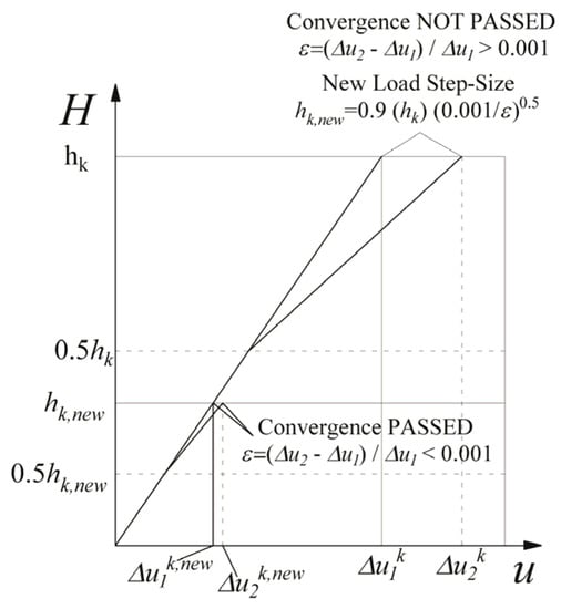 When this convergence criterion is not passed, the iterative process starts again with an updated load increment hknew which should be able to achieve the desired accuracy and can be estimated using Equation (7), as described in Press et al. [].