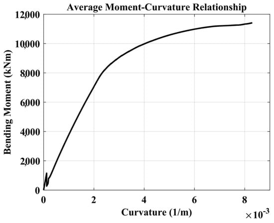 The soil unit weight, γ, of the soil was not reported in the article of Huang et al. [] however it was estimated according to the interpretation of the CPT test data. Along the depth of interest, approximately equal to the first 15 m, corresponding to 10 pile diameters, the mean tip resistance was approximately 5 MPa. The mechanical properties of the pile used in the analysis were the same as those indicated in Table 2. Figure 9 presents the average moment-curvature relationship used in the analysis and computed using the model that considers the tension stiffening.
