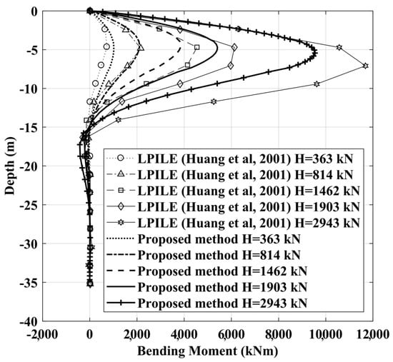 In addition, Figure 13 compares the bending moments profiles for various load values computed with the proposed method and those obtained by Huang et al. [] using LPILE. Note that in the work of Huang et al. [] the load of 1462 kN was identified as the value at which corresponds the beginning of cracking in the concrete, and therefore there is a progressive decrease in the flexural rigidity EpIp.