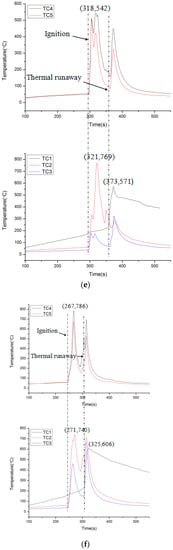 Moreover, it is interesting to find that the safety vent cracks temperature, the ignition temperature, and the thermal runaway temperature exhibit similar values for the same conditions, as shown in Figure 9. This reveals that LIB will fail at a certain temperature; the voltage has little influence on these parameters, and they mainly depend on the incident heat. This result is consistent with the research of Bilbao [].