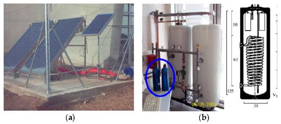 (a) Solar thermal collectors (b) Hot-water tanks with PCM modules. Reproduced with permission from []. Elsevier: Solar Energy Materials and Solar Cells, copyright 2006.