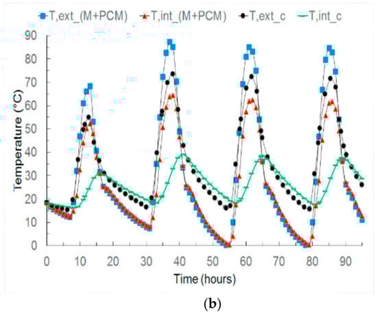 With the increasing emission of carbon dioxide, blending PCMs in building materials or directly using PCMs as wall boards, is able to store considerable energy during the daytime at high temperature and release energy at night when temperature is low by melting and solidifying processing. The combination of PCMs with building materials has showed superior performance which can contribute to energy saving, electricity shifting and human comfort [,,,,]. Figure 4a showed a schematic of a kind of full-scale room with PCM concrete wallboards. As seen in Figure 4b, the effects of alleviating temperature fluctuation of a kind of PCM wall room compared with ordinary room are apparent []. However, PCMs used in construction field has certain requirements in terms of phase change temperature, stability, strength and price. Consequently, it is a significant step to choose suitable materials and methods of building envelope enclosures, as it is a major parameter to decide by what extent the thermal mass is activated. High fusion heat, odorless and nontoxic properties make salt hydrates be good candidates for construction energy saving.