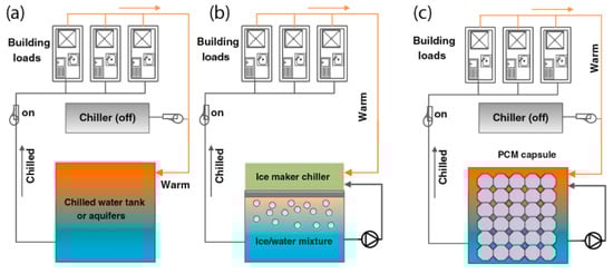 (a) Chilled water tank for air conditioning; (b) Ice storage tank for air conditioning (c) PCM storage tank for air conditioning. Reproduced with permission from []. Springer: Energy Solutions to Combat Global Warming, copyright 2016.
