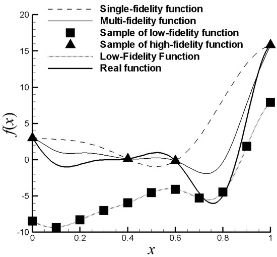 where is a function predicted by an RBF [19,20] using low-fidelity data and and are correlation terms between the low-fidelity data and the high-fidelity data. Further, can be defined as: