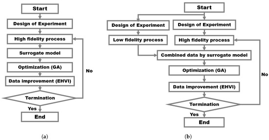 Flowchart of efficient global optimization: (a) single-fidelity efficient global optimization (EGO); (b) multi-fidelity EGO.