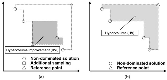 The procedure of EGO with the ordinary kriging model is illustrated in Figure 2a. The EGO process starts with the generated initial samples. In this study, the Latin hypercube sampling (LHS) is employed. Sample data are evaluated, and the model is predicted using the kriging method. An arbitrary optimization method can be used to find an additional point by maximizing an EHVI [17,18]. The EHVI is the function of the hypervolume improvement (HVI) combined with the uncertainty of the additional point. HVI is calculated from the hypervolume improvement of the additional sampling and the non-dominated solution shown in Figure 3a.